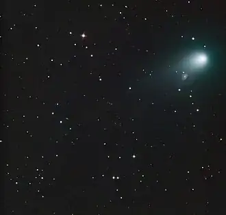 The comet came to perihelion on 1 October 2012,[7] and was expected to reach about apparent magnitude 15.2, but due to an outburst the comet reached apparent magnitude 8.[8] As a result of the outburst of gas and dust, the comet was briefly more than 500 times brighter than it would have been without the outburst.[b] On 19 October, images by the Virtual Telescope Project showed a dust cloud trailing the nucleus.[9] Images by the 2 m (79 in) Faulkes Telescope North on 26 October,[10] confirm a fragmentation event.[11] The secondary fragment was about magnitude 17. Further observations by the 8.1 m (320 in) Gemini telescope show that the comet fragmented into at least four parts in six fragmentation events.[10][12][13]
