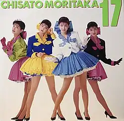 A cover version of "17-sai" was recorded by Chisato Moritaka and released by Warner Pioneer on May 25, 1989 as her seventh single. She debuted the song during her Mite ~Special~ Live Tour earlier that year. This version is known for its Eurobeat arrangement and Moritaka's catchy dance choreography on live performances, which often features colorful costumes with flashy miniskirts. The single peaked at No. 8 on Oricon's singles chart and sold 195,000 copies, making it her first top 10 single and her first single to sell over 100,000 copies.[6] It was also ranked at No. 43 on Oricon's 1989 year-ending chart.[7][8][1] Moritaka's "17-sai" was nominated for the Grand Prix at the 22nd Japan Cable Awards, but lost to Princess Princess' "Diamonds".[9]