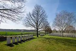 While tunnelling at Hooge during the defence of Ypres, the 177th Tunnelling Company also built a forward accommodation scheme in the Cambridge Road sector along the rear edge of Railway Wood, halfway in between Wieltje and Hooge. The Cambridge Road dugout system was located within 100 metres (110 yd) of the front line. It was connected to the mining scheme beneath Railway Wood and eventually became one of the most complex underground shelter systems in the Ypres Salient. Its mined galleries were named after London streets for easy orientation.[9] Further projects involved 177th Tunnelling Company constructing new dugouts beneath the Menin Road in the centre of Hooge, located in between 175th TC's July 1915 mine crater and the stables of the destroyed Château de Hooge.[13] Parts of these dugouts now lie beneath the Hooge Crater CWGC Cemetery opposite the "Hooge Crater Museum". 177th Tunnelling Company also built the Birr Cross Roads dugout and dressing station beneath the Menin Road further west of Hooge,[14] and the Canal Dugouts along the Ieperlee.[15]