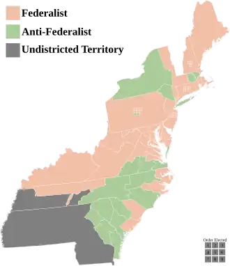 - ^ a b c d Includes late elections: North Carolina and Rhode Island ratified the United States Constitution after the 1st Congress had started to meet, and did not hold their elections for U.S. representatives until February and August 1790, respectively.