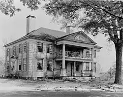 The structure stands two stories tall beneath a hip roof, seven bays wide and four bays deep. It is of frame construction covered with clapboard, except at the front where it is imitation ashlar; wood quoins ornament its corners. A two tier Doric porch projects from the front facade, with single-story Tuscan pillars supporting the porch, and two-story Doric pillars at the corners. The upper level has a balustrade with Chinese railings. The two sides and rear also contain entrances, and the rear facade was once graced with a large Palladian window. (As of 2005, the rear facade seems to have been obliterated in a large-scale extension to the building.) There are two interior end chimneys.