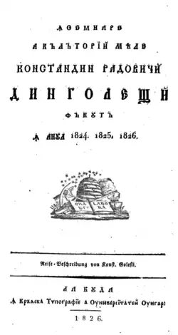 - May 18 – At Buda, Habsburg Hungary, Wallachian intellectual Dinicu Golescu receives imprimatur for his Însemnare a călătoriei mele (Accounts of My Travels).[16] This pioneering travelog covers extensive trips in Central and Western Europe, which Golescu had begun in 1824. The author documents his own "amazed 'discovery' of the West [and] acceptance of his country's admitted inferiority."[17] As a "manifesto for the new culture" Însemnare promotes Wallachia's passage into the Age of Enlightenment. For the same purpose Golescu sponsors a school on his estate.[18]