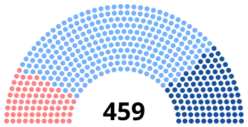 Note that these groupings are not formal party affiliations. Instead, they reflect groupings made by later historians based on the political opinions of the deputies. Historians do not always agree on how to draw these lines: Thomas Beck gives a similar number for the pro-government representatives (273), but assigns far more of the opposition to the left (170), leaving only seven legitimists.[4]
