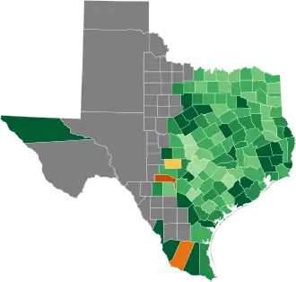 With the state media overwhelmingly behind him,[2] Texas overwhelmingly voted for Breckinridge by a margin of 50.97 points. Breckinridge won 75.47 percent of the vote, making Texas his strongest state.[5] Despite the allegiance of Douglas supporters, Bell carried only three counties in the state and it is sometimes thought that the German-American abolitionists in such counties as Gillespie refrained from visiting the polls.[6] Besides the counties he won, Bell only exceeded forty percent of the vote in six other counties. Douglas gained a mere 18 votes as a write-in candidate.