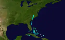 Late on September 29, the ships Josephine B. Small, Gen. Marshall, and New Light encountered a Category 1 hurricane several hundred miles north of the Bahamas. Tracking to the north, the storm system gained very little strength while passing several hundred miles southwest of Savannah, Georgia. It reportedly attained Category 2 hurricane status while located approximately 100 mi (160 km) to the east of Cape Hatteras, North Carolina, with winds peaking at 105 mph (165 km/h). Spinning to the north-northeast, the hurricane eventually entered a weakening phase, and its last reported location was approximately 285 mi (460 km) northeast of Virginia Beach, Virginia. This hurricane never made landfall.[7] Chenoweth proposed that this system began as a subtropical storm on September 27. The storm transitioned into a subtropical cyclone and intensified into a hurricane as it nearly executed a cyclonic loop, before accelerating to the northeast on September 30. On October 1, the cyclone was last noted south of Newfoundland.[6]
