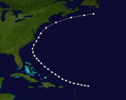 The bark St. Ursula observed a hurricane about 375 mi (600 km) east-northeast of Dominica on July 28.[8] Tracking generally northwestward, the storm changed little in intensity until located to the north of Grand Turk. From there, it proceeded northwestward, and intensified to near Category 1 hurricane status. As it moved to the southwest of Wilmington, North Carolina, the storm attained its peak intensity of 105 mph (165 km/h) and a minimum barometric pressure of 969 mbar (28.6 inHg),[7] based on observations from a ship located about 140 mi (230 km) east of Norfolk, Virginia.[8] Shortly thereafter, the cyclone commenced re-curving to the northeast and began a weakening trend, falling to Category 1 strength by early on August 2. Further weakening occurred while the hurricane was located to the west of Sable Island. The storm was last reported to the south of Cape Race on the island of Newfoundland on August 3.[7]