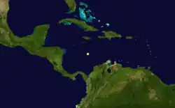 This tropical storm is known from having wrecked the schooner Three Sisters on the night of October 9 at Saint Martin in the eastern Caribbean.[24] Neither Fernández-Partagás and Diaz nor the Atlantic hurricane reanalysis project could construct a track beyond the single point, with the cyclone possessing sustained winds of 45 mph (75 km/h).[3] The storm may have been associated with other weather reports in the Lesser Antilles. For example, Barbados recorded 7 in (180 mm) of precipitation on October 7.[24] Some ships were wrecked in the Lesser Antilles, especially on Martinique, which also reported damage to ships, plantations, and several buildings.[25] Puerto Rico also reported flooding and shipwrecks on October 13. However, it is uncertain if impacts in any areas other than Saint Martin were related to the cyclone.[24] Chenoweth traced this cyclone back October 8 as a tropical storm just east of the Windward Islands, passing over Martinique that day. The storm intensified into a hurricane and clipped Puerto Rico before striking the Dominican Republic. Another landfall occurred on Cuba as a tropical storm, before the system dissipated over the island on October 12.[6]