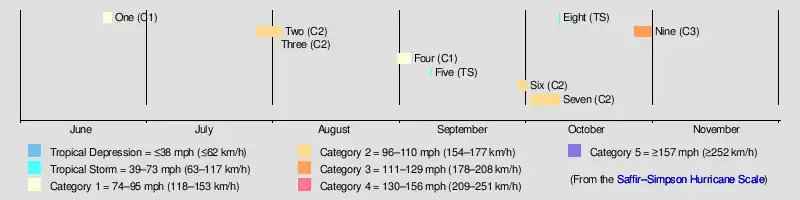 | Seven | October 2–9 | Category 2 hurricane | 105 (165) | 965 | Tamaulipas, Gulf Coast of the United States (Louisiana and Florida) | Unknown | 27 | [12][14] | ||