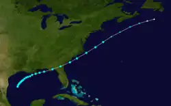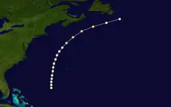 The first known tropical cyclone of the season was observed on September 3, about halfway between the Bahamas and Bermuda.[1] A nearby ship estimated winds of 80 mph (130 km), indicating the presence of the hurricane.[4] It moved northward initially, passing about 220 mi (350 km) west of Bermuda on September 4. Thereafter, the hurricane turned toward the northeast,[1] and the ship "John Richardson" encountered gale force winds on September 5, resulting in a wreck of its cargo.[2] On September 6, it was estimated to have reached peak winds of 105 mph (169 km/h), based on observations from the ship with the call sign "Greenock".[4] The hurricane lashed the ship with strong winds for 14 hours, killing the captain and one crewman. At the time, it was about 400 mi (640 km) southeast of Halifax, Nova Scotia.[2] Turning to the northeast, the hurricane passed south of Newfoundland before last being observed on September 7.[1]