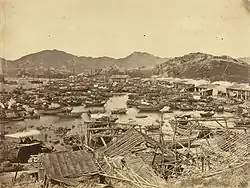 Ernst Eitel recounted how many of the European and Chinese houses were ruined and became roofless; big trees were unrooted and corpses were found in the ruins and started surfacing at the waterfront from the wrecked ships.[8]
