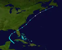 Although the schooner O. S. Bailey reported gales on November 17,[31] the track listed in HURDAT begins on the next day over the southeastern Bahamas about 35 mi (55 km) north of Inagua. Around 00:00 UTC on November 19, the storm intensified into a hurricane while moving northward. About 24 hours later, it is estimated that the cyclone intensified into a Category 2 hurricane with winds of 105 mph (165 km/h). However, around 12:00 UTC on November 20, the storm transitioned into an extratropical cyclone about 185 mi (300 km) southeast of Nantucket, Massachusetts.[3] Later that day, Halifax, Nova Scotia, recorded a barometric pressure of 968 mbar (28.6 inHg), forming the basis for the peak intensity estimate while the storm was still a tropical cyclone.[32][5]