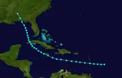 Similar to the path constructed by meteorologist C. J. Neumann in 1993,[13] the official track begins on October 9 about 240 mi (385 km) east-northeast of Barbados. Moving west-northwestward, the storm passed through the Lesser Antilles on the next day, striking Martinique before entering the Caribbean. On October 12, the cyclone struck or moved very close to Jamaica with winds of 60 mph (95 km/h). Shortly after turning north-northwestward on October 14, the system made landfall in Cuba on Isla de la Juventud and then near La Coloma in Pinar del Río Province. The storm entered the Gulf of Mexico and likely underwent little change in intensity before making its final landfall near Fort Walton Beach, Florida, around 08:00 UTC on October 16. Several hours later, the cyclone dissipated over central Alabama.[3]