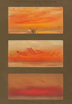 The 1883 Krakatoa eruption darkened the sky worldwide for years afterwards and produced spectacular sunsets worldwide for many months. British artist William Ascroft made thousands of colour sketches of the red sunsets halfway around the world from Krakatoa in the years after the eruption. The ash caused "such vivid red sunsets that fire engines were called out in New York, Poughkeepsie, and New Haven to quench the apparent conflagration".[31] This eruption also produced a Bishop's Ring around the sun by day, and a volcanic purple light at twilight. In 2004, an astronomer proposed the idea that the red sky shown in Edvard Munch's 1893 painting The Scream is an accurate depiction of the sky over Norway after the eruption.[32]