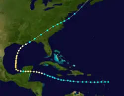 Maritime observations indicated the presence of a tropical storm over the northwestern Caribbean as early as June 15.[7]: 24 Moving north-northwestward, the cyclone struck the Guanahacabibes Peninsula of Cuba several hours later, likely as a minimal hurricane with sustained winds of 75 mph (120 km/h),[6] according to a study of wind damage conducted by meteorologist Ramón Pérez Suárez in 2000.[4] However, the hurricane weakened back to a tropical storm shortly after reaching the Gulf of Mexico on June 16. Gradually curving northeastward on June 17, the system made landfall near Cedar Key, Florida, with winds of 50 mph (85 km/h) around 14:00 UTC. After emerging into the Atlantic from the First Coast on the following day, the system remained closely offshore Georgia, South Carolina, and North Carolina. The cyclone was last noted on June 20 about 115 mi (185 km) southwest of Sable Island, Nova Scotia.[6]