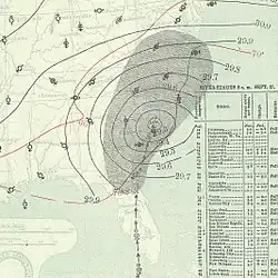 After moving generally northward across the Straits of Florida, the cyclone made landfall in Key West, Florida, around 11:00 UTC on September 25 with winds of 80 mph (130 km/h). Reanalysis suggests that the hurricane intensified further, becoming a Category 2 hurricane again by 18:00 UTC, about one hour before striking near Punta Rassa, Florida, with winds of 105 mph (165 km/h).[2] Upon landfall, the system had an atmospheric pressure of 975 mbar (28.8 inHg), the lowest known in relation to the storm.[1] The hurricane curved north-northeastward and briefly weakened to a tropical storm near Orlando around 06:00 UTC on September 26, before re-strengthening into a hurricane just prior to emerging into the Atlantic near modern-day Palm Coast about six hours later. At about 07:00 UTC on the following day, the system made landfall near Port Royal, South Carolina, with winds of 90 mph (150 km/h). The hurricane then curved east-northward and weakened to a tropical storm over far southeastern North Carolina early on September 28. Briefly re-emerging into the Atlantic, the cyclone made another landfall near Atlantic Beach with winds of 70 mph (110 km/h). After again entering the Atlantic from northern Dare County, the storm re-intensified into a hurricane early on September 29. However, the cyclone weakened back to a tropical storm about 24 hours later while passing offshore New Jersey. The storm was last noted early on October 1 about 120 mi (195 km) east of Nantucket, Massachusetts.[2]