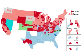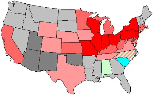 The fragmented and disoriented Democratic Party was crushed everywhere outside of the South, losing more than 55% of its seats to the Republican Party. The Democrats did so poorly that even in the South, they lost seats to the Republican-Populist electoral fusion in Alabama, North Carolina, Tennessee, Kentucky, and Texas.[2][3] The Democrats ultimately lost 127 seats in this election, with the Republicans gaining 130 seats after the resolution of several contested elections.