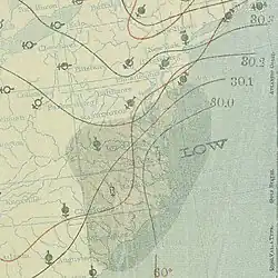 ![]() Surface weather analysis of the hurricane off the Mid-Atlantic coast on October 11, 1896 | |