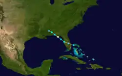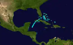 A tropical depression formed over the northwestern Caribbean on September 25. Moving northeastward, the depression brushed Cuba's Isla de la Juventud on the following day and then made landfall on the main island along the north shore of the Gulf of Batabanó.[3] Havana observed a barometric pressure of 1,008 mbar (29.8 inHg),[4] the lowest in relation to the storm. Thereafter, the cyclone emerged into the Straits of Florida late on September 26 and then intensified into a tropical storm early the next day. Throughout September 27, the system crossed the northwestern Bahamas, including striking the Abaco Islands with winds of 50 mph (85 km/h).[3] After exiting the Bahamas on September 28, the cyclone weakened, possibly due to the approach of the previous storm, and was last noted several hours later.[4]
