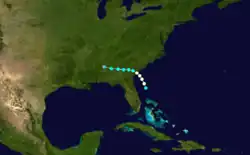 Although the steamship Philadelphia first encountered this storm north of Puerto Rico on September 27, a 1993 reanalysis by meteorologist C. J. Neumann began the track for this system about 200 mi (320 km) east of Guadeloupe two days earlier.[4][3] Traveling northwest, the storm intensified into a hurricane on September 26 and then into a Category 2 hurricane on September 27. While nearing the coast of the Southeastern United States, the cyclone became a Category 3 hurricane early on October 1 and then a Category 4 hurricane the next day. Around 12:00 UTC on October 2, the storm peaked with maximum sustained winds of 130 mph (215 km/h) and a minimum barometric pressure of 938 mbar (27.7 inHg). The hurricane then made landfall on Cumberland Island, Georgia, four hours later at the same intensity. Early on October 3, the system weakened to a tropical storm over west-central Georgia and a tropical depression over northeastern Alabama several hours later. The cyclone turned northeastward over Indiana and then east-northeastward over Ontario. After emerging into the Gulf of St. Lawrence, the storm struck Newfoundland on October 6 and promptly dissipated.[3]