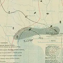 Parts of Louisiana experienced heavy rainfall. Plaquemine reported 4 in (100 mm) of precipitation in only a few hours, damaging local sugarcane crops.[22] In Lake Charles, rains flooded streets and caused losses to rice crops, while winds downed many telephone poles.[23] Similarly, the town of Jennings noted damage to rice crops, with losses totaling "many thousands", according to The Times-Democrat.[24] Farther east, New Orleans reported sustained winds up to 42 mph (68 km/h).[10] Precipitation generated by the storm in Mississippi led to a washout along the Yazoo and Mississippi Valley Railroad.[25] Elsewhere, winds and precipitation from the storm and its remnants spread across parts of the Mississippi Valley and Eastern United States.[10]