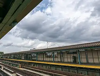 The 18th Avenue station opened on June 24, 1916, as the terminal of the first portion of the BMT West End Line, which extended from 36th Street on the BMT Fourth Avenue Line.[3][4] The line was originally a surface excursion railway to Coney Island, called the Brooklyn, Bath and Coney Island Railroad, which was established in 1862, but did not reach Coney Island until 1864.[5] Under the Dual Contracts of 1913, an elevated line was built over New Utrecht Avenue, 86th Street and Stillwell Avenue. The section of the West End Line between 62nd Street and this station originally opened with only one track in service. The second track between 62nd Street and 18th Avenue opened on July 8, 1916.[6]