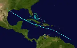 A tropical depression developed about 415 mi (670 km) south-southwest of Paramaribo, Suriname, on August 18. The system moved just north of due west throughout its duration and deepened into a tropical storm about 24 hours later. On August 20, the cyclone peaked with maximum sustained winds of 50 mph (80 km/h). Late on August 20, the storm passed through the Windward Islands just north of Grenada.[4] According to Governor-in-Chief of the Windward Islands Robert Baxter Llewelyn, no damage occurred on Grenada. At Barbados, three lighters and a schooner, the Myosettis, were wrecked. The jetties and vessels at them were destroyed on Saint Vincent.[6] After reaching the Caribbean, the cyclone began weakening, probably due to colder sea surface temperatures and the storm's proximity to South America.[14] On August 21, the cyclone weakened to a tropical depression. Continuing westward, it dissipated at 18:00 UTC on the following day while situated about 65 mi (105 km) west-northwest of Aruba.[4]