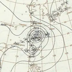 On September 8, a low pressure area formed east of the Philippines. It intensified into a tropical storm while moving to the northwest, passing near the Ryukyu Islands on September 17. After bypassing Taiwan to the north, the storm approached the mouth of the Yangtze in eastern China, before recurving to the northeast. It was last noted on September 21 in the Sea of Japan.[6][16] On the last day of the month, a typhoon formed west of Palau. Steered to the northwest, the storm moved across northern Luzon, hitting Nueva Ecija and Pangasinan. After emerging into the South China Sea, the storm turned to the northeast, brushing the Batanes islands as well as southeastern Taiwan on October 4. Crossing the Ryukyu Islands, the storm was last noted on October 6 to the southwest of Kyushu.[6][17]