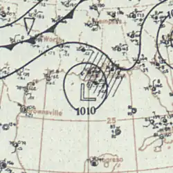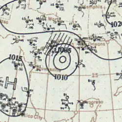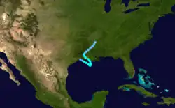 A ship first observed this tropical storm about 245 mi (395 km) north-northwest of Telchac Puerto, Yucatán, at 12:00 UTC on September 16.[1][5] The storm intensified gradually while moving northwestward, peaking with maximum sustained winds of 70 mph (115 km/h) at 00:00 UTC on September 18. However, the cyclone soon quickly weakened, falling to tropical depression intensity about 18 hours later. It then dissipated about 70 mi (115 km) south-southwest of the Texas–Louisiana state line.[1]
