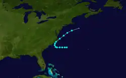 A tropical depression developed on May 24 at 12:00 UTC about 50 mi (80 km) southwest of Cockburn Town, Turks and Caicos Islands. Moving northwestward, the depression struck the Turks and Caicos Islands. Around 06:00 UTC on May 26, the depression intensified into a tropical storm. By late on May 27, the storm curved northeastward. The cyclone strengthened into a hurricane by 06:00 UTC the following day,[1] becoming one of only three May hurricanes in the 20th century, with the others being Able in 1951 and Alma in 1970.[3] The cyclone made landfall west of Cape Hatteras, North Carolina, with winds of 75 mph (120 km/h) around 21:00 UTC on May 29.[1] A few hours later, the cyclone re-emerged into the Atlantic Ocean. Early on May 30, the hurricane weakened to a tropical storm. Accelerating northeastward, the storm struck eastern Long Island, New York, with winds of 40 mph (65 km/h) late on May 30, just prior to making landfall near Noank, Connecticut, at the same intensity around 23:00 UTC. The storm became extratropical over southern Maine early on May 31. The remnants continued northeastward until dissipating over the northern portion of the state several hours later.[1]