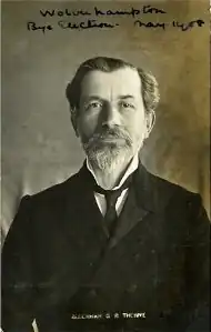 Thorne, who had stood unsuccessfully for election twice in the South and West divisions of Wolverhampton, seemed in nearly every way the stereotypical Liberal of his day; a pronounced nonconformist, a Baptist,[2] in a constituency where there were many nonconformist voters.[3] In his election meetings and literature he declared himself a supporter of free trade, the proposed Bill on Old Age Pensions, restricting to eight the hours that miners could be made to work daily, women’s suffrage, Irish Home Rule and any necessary reform of the House of Lords.[4] He was also strongly in favour of temperance and a supporter of the disestablishment of the Church of England.[2] Fowler had been unopposed in two of the previous four elections, and had won the last, in 1906, with more than two thirds of the votes cast, a majority of 2,865.[5]