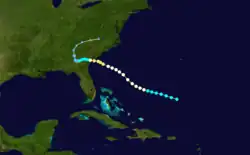 The final storm was first observed as a disturbance near Puerto Rico in the Caribbean Sea in late October.[17] The disturbance was the precursor to a tropical depression which developed over the southern Bahamas and headed west-southwestward across Cuba,[1] where, at Havana, winds blew from the southeast at 44 mph (71 km/h).[17] It became a tropical storm on October 27 and drifted southwestward. Near the eastern tip of the Yucatán Peninsula, the storm turned sharply northward.[1] An area of high pressure over the United States prevented the cyclone from turning eastward toward Florida, and it continued into the Gulf of Mexico. However, on October 31, the storm curved eastward and moved ashore over northern Florida. The storm decreased in intensity as it passed into the Atlantic.[17] The storm's circulation center remained poorly defined throughout its course. It was long believed to have developed south of Cuba, although a reevaluation of ship data indicated the depression had actually formed east of the island.[2] On October 26, the Weather Bureau hoisted hurricane warnings along the east coast of Florida from Key West to West Palm Beach, and on the west coast up to Tampa.[18]