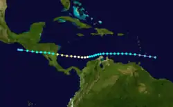 The next storm formed well to the east of the Lesser Antilles on September 3 and moved westward, attaining tropical storm status about a day later. The storm slowed and curved toward the southwest, nearing the northern coast of Colombia before pulling away from land and strengthening into a hurricane. It further intensified to Category 2 status before striking Nicaragua on September 10. Quickly weakening to a tropical storm, the cyclone continued westward across Central America and briefly entered the eastern Pacific Ocean. It dissipated shortly thereafter.[1] In the town of Corinto, a report indicated the deaths of 10 people and 50 additional injuries. About 250 houses were destroyed, leaving approximately $2 million (1911 USD, $67.5 million 2014 USD) in damage.[16] Data on this storm is extremely scarce; as such, only minor revisions could be made to its chronology in the hurricane database.[2]