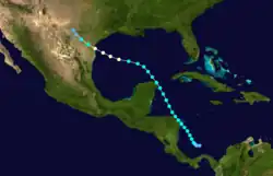 Weather maps and ship data indicate the development of a tropical depression in the southwestern Caribbean Sea around 06:00 UTC on June 21.[3] Moving north-northwestward, the depression accelerated and intensified into a tropical storm on the following day. Early on June 23, the storm made landfall near the HondurasNicaragua border with winds of 40 mph (64 km/h). Thereafter, it continued north-northwestward and oscillated slightly in strength. The system made another landfall near Cancún, Quintana Roo, with winds of 45 mph (72 km/h) late on June 25. After briefly crossing the Yucatan Peninsula, the cyclone emerged into the Gulf of Mexico and eventually began moving more to the west-northwest. Early on June 27, it deepened into a Category 1 hurricane and peaked with maximum sustained winds of 75 mph (121 km/h). The hurricane then curved northwestward and made landfall in Padre Island, Texas, at the same intensity around 01:00 UTC on June 28. After moving inland, the storm quickly weakened and dissipated over Val Verde County just under 24 hours later.[4]