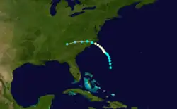 Weather maps and ship data indicated a tropical depression formed near the west coast of Africa on August 26.[3] Early the next day, the system strengthened into a tropical storm. It then tracked westward for several days, threatening the Lesser Antilles before turning north-northwestward on September 3. Eventually, the storm recurved to the northeast before beginning an eastward direction on September 7. The following morning, it peaked with maximum sustained winds of 70 mph (110 km/h) – just shy of hurricane status. Thereafter, the cyclone moved northward to northwestward for the next few days. Around 12:00 UTC on September 12, the storm became extratropical while located about 290 mi (470 km) southeast of Cape Race, Newfoundland and Labrador.[4]