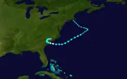 A tropical storm developed about halfway between Bermuda and the Bahamas at 12:00 UTC on August 30. The storm moved slowly north-northwestward and approached the East Coast of the United States. By September 1, it intensified into a Category 1 hurricane. Eventually, the hurricane curved to the northwest. While located offshore North Carolina early on September 3, the cyclone peaked with maximum sustained winds of 85 mph (137 km/h) and a minimum barometric pressure of 976 mbar (28.8 inHg), making it the strongest tropical cyclone of the season. Hours later, it made landfall near Cape Lookout at the same intensity. Shortly after moving inland, the system weakened to a tropical storm. By September 4, it deteriorated to a tropical depression before dissipating over northeastern Georgia.[4]