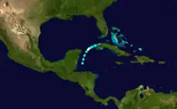 The final tropical storm developed in the northwestern Caribbean Sea about 60 mi (97 km) southeast of Banco Chinchorro, Mexico, at 00:00 UTC on October 28. Moving north-northeast, the storm reached Category 1 hurricane intensity about 24 hours after its classification. Around that time, it peaked with maximum sustained winds of 75 mph (121 km/h). Around 06:00 UTC on October 29, the system made landfall near Cape San Antonio, Cuba, at the same intensity. After about six hours over Cuba, the hurricane weakened to a tropical storm.[4] It transitioned into an extratropical cyclone in present-day Mayabeque Province before being absorbed by a frontal boundary shortly thereafter.[3][4]