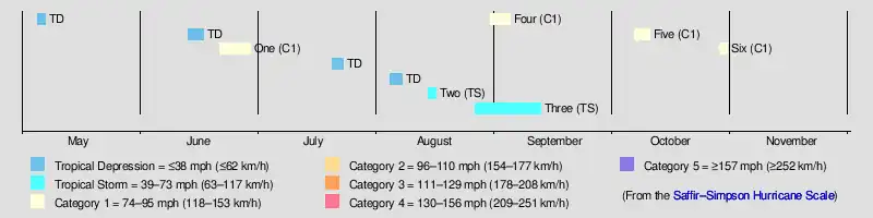 Of the season's ten tropical cyclones, six became tropical storms and four strengthened into hurricanes. Furthermore, none of these strengthened into a major hurricane—Category 3 or higher on the modern-day Saffir–Simpson hurricane wind scale—marking the sixth such occurrence since 1900.[1] The strongest hurricane of the season peaked as only a Category 1 with winds of 85 mph (137 km/h). That system left five deaths and at least $4 million in damage in North Carolina. The first hurricane of the season also caused one fatality in Texas, while damage in South Carolina from the fifth hurricane reached at least $75,000.