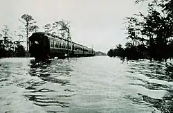 Days of downpours in the state flooded approximately 350,000 acres (140,000 ha) of land;[9] the most prolific freshwater flooding followed the Cahaba and Alabama rivers through Perry, Dallas, Wilcox, and Monroe counties, where collectively 250,000 acres (100,000 ha) of farmlands was inundated and $2.5 million worth of crops were destroyed,[22] contributing to an estimated statewide total of $5 million in lost crops. In the same area, at least 2,000 families were forced to evacuate their homes.[21] Residents along the Coosa River faced destitution and fears of famine, resulting in a rush to slaughter cattle for food.[21] For 170 mi (270 km) of its course, the Tombigbee River flooded 1.25 mi (2.01 km) of land on both sides.[9] Multiple people drowned in floodwaters in Birmingham and Tuscaloosa,[30] and in some communities, residents clung to treetops to escape raging floodwaters. In Birmingham, the flooding closed manufacturing plants.[31] Railways and train trestles were washed out or blocked by landslides,[13] with one railroad in particular, the Southern Railway, having service interrupted on a total 140 mi (230 km) of track, mostly south and west of Birmingham.[32]