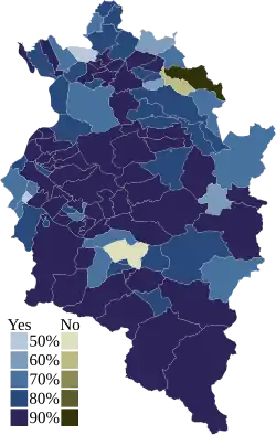 The referendum was held on May 11 and showed that 80.7% of voters and a majority in 93 out of 96 municipalities voting in favor. The only municipalities with a majority opposing the proposal were Bludenz, Bolgendach and Hittisau.[3] The exact numbers for the referendum have been contradicted by several sources due to errors in the transmission of results from several municipalities, leading to manual corrections of previously printed announcements. According to Ulrich Nachbaur, head of the Vorarlberg State Archives, the final count was 48,302 yes and 11,552 no.[1]