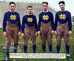 Three of the Four Horsemen, Stuhldreher, Crowley, and Layden, were consensus first-team picks on the 1924 All-America college football team.[4] Other notable players included tackle Joe Bach and center Adam Walsh. The Four Horsemen, Walsh, and coach Rockne were all later inducted into the College Football Hall of Fame.[5][6][7][8][9][10]