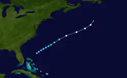 The first indications of a tropical cyclone developing were on August 17. A ship in the vicinity of the developing system reported winds of 40 mph (64 km/h) over 78 °F (26 °C) waters.[5] Around 0000 UTC the next day, the system was classified as a modern-day tropical depression with sustained winds estimated at 30 mph (48 km/h). Roughly 18 hours later, the depression strengthened into a tropical storm, the first of the season while located to the north-northeast of the Bahamas. Gradual intensification took place throughout most of the storm's life[6] as it traveled towards the northeast[7] until becoming a hurricane around 0600 UTC on August 20.[6] About 30 minutes later, a ship recorded winds of 45 mph (72 km/h)[5] and a pressure of 993.6 mbar (hPa),[2] the lowest pressure recorded in relation to the small storm.[2][5] Shortly after, the storm reached its peak intensity with winds of 80 mph (130 km/h).[6] Increasing in forward motion, the storm became extratropical early on August 21 after turning towards the north.[6][7]