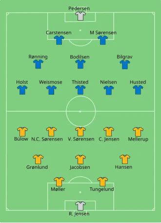 IK Aalborg Chang and Horsens FS (reserves) finished last in their respective groups and hence had to contest in play-off matches for their spots in the 1927–28 JBUs Mesterskabsrække. Kolding BK qualified to the play-offs by winning their JBUs A-række south group final match on 22 May 1927 against Vejen SF with 2–0, while Randers SK Chang secured a victory against Ry BK in their JBUs A-række north group final match.[31] Randers SK Chang's line-up for the match was composed of Pind (goalkeeper) – Heron Sørensen, Evald Larsen (defenders) – Carl Emil Sørensen, Valdemar Hansen, Kaj Christensen (midfielders) – Petrus Milwertz, C. Holting, Keill, H. Broberg and Willy Hansen (forwards).[32] IK Aalborg Chang's line-up consisted of Erik Bratten (goalkeeper) – Ingvald Petersen, captain Tom Nielsen (defenders) – Ejner Thomsen, Oscar Jensen, Aage Larsen (midfielders) – Jens Anker Arentoft, Fritz Jensen, Kaj "Mester" Eriksen, Baldus Buus and K. E. Christiansen (forwards), which was different from the team's main line-up due to sick leaves.[32][33][34] Horsens fS reserves's reinforced line-up featured Jerichau (goalkeeper) – Kaj Kleine, Emborg (defenders) - Hartvig Petersen, Herluf Petersen, Mar. Hansen (midfielders) – Viggo Mellerup, Sigvald Sørensen, Børge Beck, Victor Hansen and Henry Jacobsen (forwards).[35] The team of Kolding BK included P. Wergeltoft (goalkeeper), Emil Hansen, Skøtt, Knudsen, Ravn, Arne Hansen, "Smeden" and Jeppesen in their squad.[36]