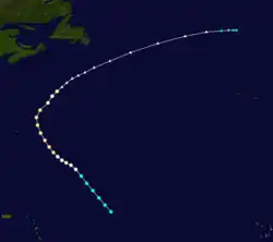A low pressure area developed into a tropical storm about 835 mi (1,345 km) east-northeast of Barbuda early on September 23.[4][5] The system moved northwest, and by 12:00 UTC on September 24, it strengthened into a Category 1 hurricane. Late on September 25, the cyclone intensified into a Category 2 hurricane. A ship recorded a pressure of 971 mbar (28.7 inHg) on September 26. Because this was measured within the storm's radius of maximum sustained winds, the hurricane's minimum barometric pressure was estimated to have been 967 mbar (28.6 inHg). Based on the pressure-wind relationship, the system peaked with maximum sustained winds of 110 mph (175 km/h). Thereafter, it curved northeastward on September 27, shortly before weakening to a Category 1 hurricane. Early on September 28, the hurricane became extratropical about 360 mi (580 km) south-southeast of Sable Island. However, the extratropical storm existed until October 1, when it dissipated well north of the Azores.[5]