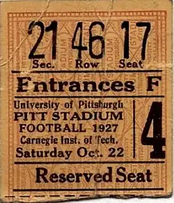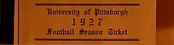 The athletic department sold 1927 football season ticket booklets to alumni, bondholders, faculty members and student family members for the first time.[28][29] Children under 16 could join the Pittsburgh Post-Gazette Fair Play Club and get a 25 cent ticket that was good for a ride on the trolley to the game, entrance to the game and then a ride home on the trolley after the game.(see photo)