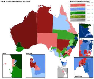 The 1928 Australian federal election was held in Australia on 17 November 1928. All 75 seats in the House of Representatives and 19 of the 36 seats in the Senate were up for election. The incumbent Nationalist–Country coalition, led by Prime Minister Stanley Bruce won a record fifth consecutive election defeating the opposition Labor Party led by James Scullin.