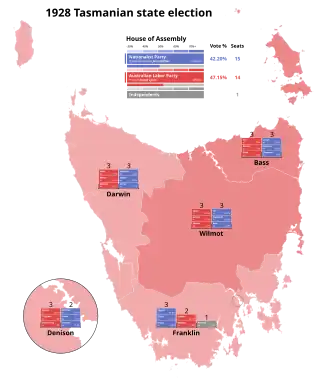 The Labor Party won a slim majority of the vote in the 1928 election, but only fourteen seats. As the Nationalist Party held half the seats in the House of Assembly and had the support of one Independent, Nationalist leader McPhee became Premier of Tasmania, and praised Lyons for his statesmanship.[2]