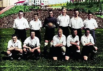 The match would be the final cap for seven of the England lineup - Hufton, Kean, Hill, Peacock, Kail, Carter, and Barry never played for their country again.[65] Kail, who played his club football for Dulwich Hamlet, was the last non-league player to represent England.[66] England made no immediate attempt at reconciliation with FIFA, not returning to the fold until 1946,[13] and rejected the invitation to compete in the 1930 World Cup, which lead the British Press Association to refer to the tournament mockingly as the "so-called World’s Association Football Championship".[67] With the rest of the world now catching up to England, they were being sought out for friendlies on a regular basis, failing to defeat both Austria and Germany in 1930,[68] the match against the former directly lead to the FA stating they were "not in favour of granting permission to alien players to be brought into this country" when Arsenal attempted to sign goalkeeper Rudi Hiden, and the International Football Association Board wrote it into law the following year.[69]