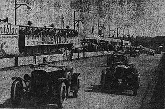As a change from recent years, the race-day was sunny and hot.[4] Caracciola, at the head of the line, was away first. On lap 2, his first flying lap, he broke the lap record (with a 6m52s) and then turned off the supercharger. This allowed the hard-charging Birkin in his Blower Bentley to close in. W.O. Bentley preferred to let the privateer do the chasing, telling his drivers to look after their cars and wave him through.[22][19] On the fourth lap, Birkin was on Caracciola's tail at the Pontlieue curves. Reaching 195 kp/h he got past the Mercedes as they braked heavily for the Mulsanne corner. Birkin did a 6m48s to set a new lap record, but on the next lap the tread came off a rear tyre and he had to pit. It took only half a minute to change the wheel, and then in only five laps Birkin was right behind the Mercedes. Just as he again overtook Caracciola on the Mulsanne Straight the tread on the other tyre let go. Although he dropped two wheels off the road, Birkin was able to complete the pass until the tyre blew at Arnage forcing him to pit yet again.[4][18]