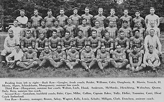 Jock Sutherland's coaching staff had to be restocked for the 1930 season. Charles W. Bowser, assistant coach in charge of the backfield, became head coach at Bowdoin College.[18] Alexander Stevenson, assistant Pitt coach and scout since 1909, contracted pneumonia upon his return from the Rose Bowl and died on February 5.[19] Andy Gustafson, former Pitt fullback, succeeded Charles Bowser as head backfield coach. He had been the head coach at Virginia Tech from 1926 to 1929.[20] 1929 All-Americans Joe Donchess and Ray Montgomery were both hired by the athletic council to assist coach Sutherland for the 1930 season. Montgomery coached the varsity linemen and taught in the physical education department. Donchess was still in medical school and assisted team physician Dr. Shanor with physical conditioning of the players. He also helped coach the ends.[21] Bill Kern, former All-American Pitt tackle,[22] was added to the staff during spring practice. He coached the linemen.[23] The appointment of Ulhardt Hangartner, former Panther guard, completed the coaching staff. He was hired to assist the linemen and be in charge of scouting.[24]