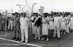 The first Maccabiah was attended by 390 athletes from 27 countries. The municipality of Tel Aviv decorated the streets with greenery and flowers. The city was coated with blue and white banners of the Maccabiah.[5] The parade started off with the participants at the Herzliya Gymnasium marching toward the stadium north of the city.[4] At the stadium, they were greeted by the High Commissioner Sir Arthur Grenfell Wauchope, who approved the games.[4] The parade was led by a convoy of horse riders, including Avraham Shapira. Among those riders was Tel Aviv's mayor, Meir Dizengoff, who rode on a distinct white horse.[3][5] 20,000 spectators were at the opening ceremony. The Maccabiah later became known as the White Horse Olympics.[2][3]